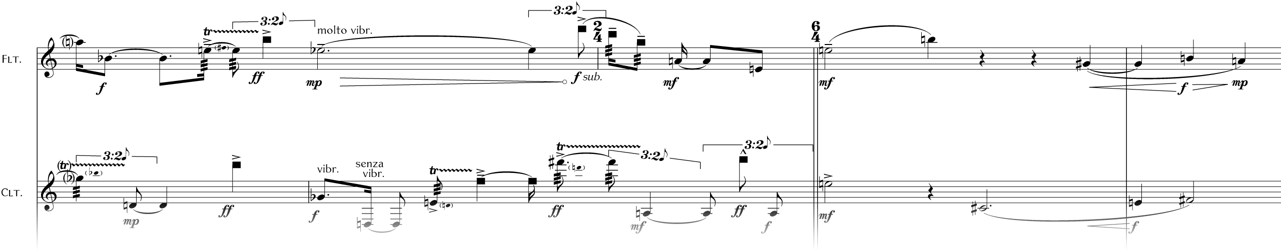 The work explores this idea in part through the parallel notion of being ‘out of sync’. The material is rooted in a deep, fundamental pulse, in groups of seven, from which the ensemble rebels and ultimately disconnects, forging its own way forward within a different metre (grouped in sixes). The fundamental material is essentially changeless in character, simply tolling out its metre in calm simple fashion, while the instruments that have split off from this pursue alternative ideas, focussing on five episodes, each of which explores a different kind of transition. Ultimately, this essential lack of synchronisation is shown in the structural divisions of the work, whch form a large 7:6 rhythmic relationship, mirrored in the shifts of metre, from seven to six. The rhythmic relationship of 7:6 can be interpreted as an attempt at perfection (7) within a context that is nothing of the kind (6).